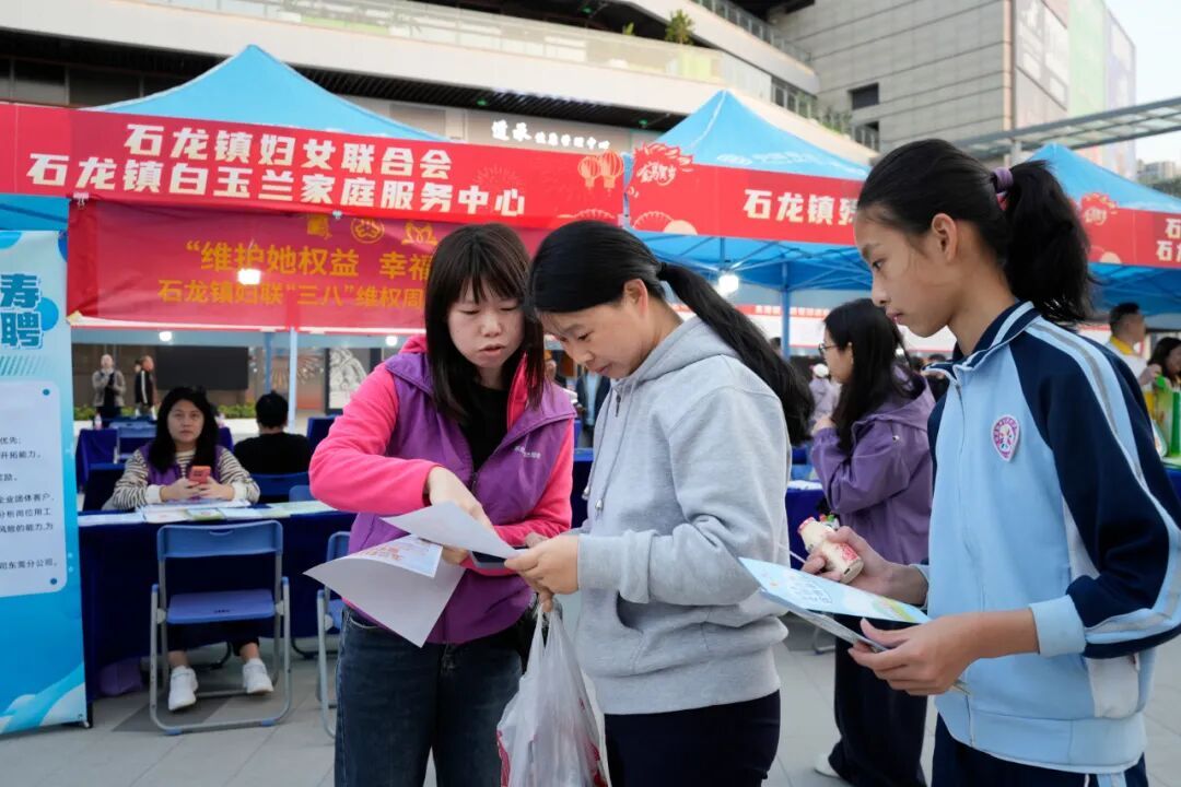 3月6日晚,石龙镇2026年“南粤春暖”现场招聘会在旗云广场火热举行。石龙镇妇联借这场就业服务盛会,同步开展“三八”维权周普法宣传行动,现场向广大求职者及过往市民普及妇女权益保障相关知识,推介“妈妈岗”就业模式,让普法服务与就业帮扶同频发力、暖心同行。